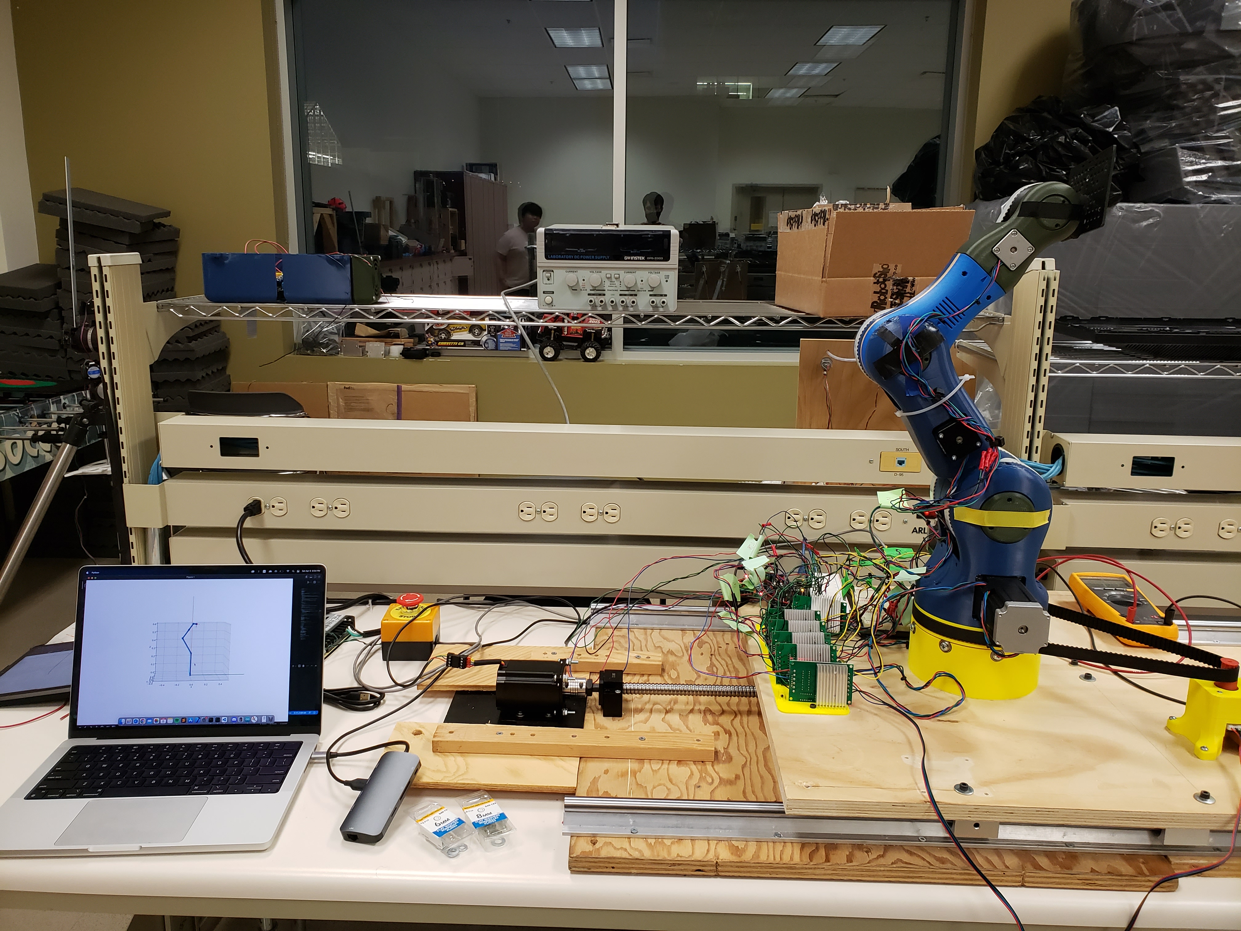 Ultimately, we were able to complete the system and move in six DoF (5 on the arm + 1 on the rail) at the target speeds, though we were unable to hit our target weight. We also left the addition of joint sensors to a future team. The final arm, rail, and software system is shown here, and a short demo video is linked below.